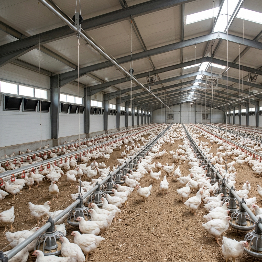 Tunnel ventilation, inlets, feeding lines, drinking systems, and climate controls for broiler, layer, and breeder houses.