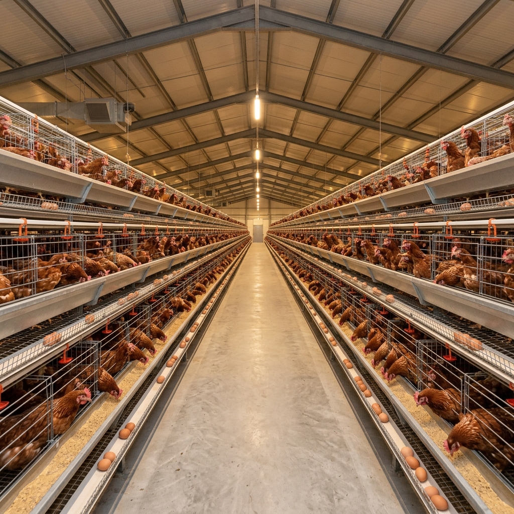 Use layer-house imagery where long-cycle air quality, feeding access, and controller visibility matter commercially.